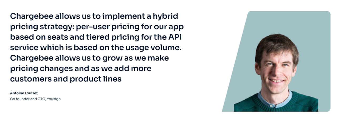 The result? With Chargebee’s support for every possible pricing model, Yousign nailed its pricing strategy by implementing a per-user pricing structure in tandem with tiered pricing. That’s hybrid pricing for the win!