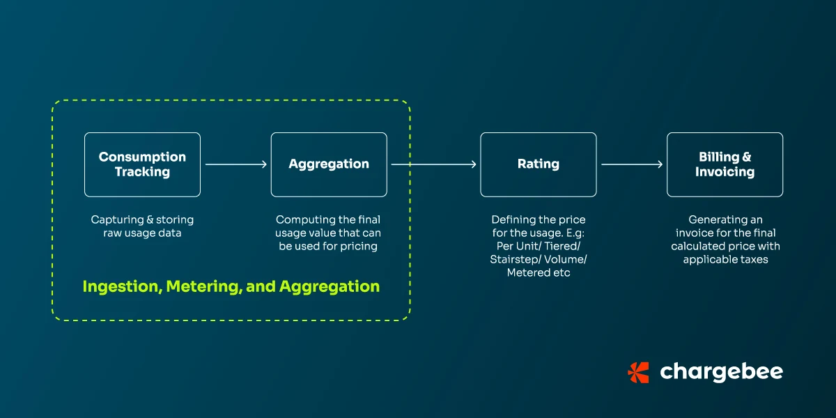 After gathering usage data through metering, the next step is aggregation. This process consolidates and computes the accumulated usage data over the billing period to determine the final value used for pricing subscription services. Aggregation involves compiling metered data, standardizing units of measurement if necessary, and summarizing usage records into larger periods like hourly or monthly totals. Aggregation could also be any function: sum(total), count (number of usages), minimum, maximum, etc.