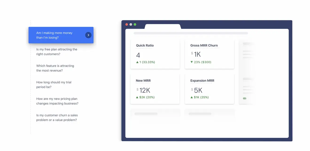 An analytics platform that provides a 360-degree view of your company's growth on a single dashboard and allows you to delve deeper into analyzing the root cause of all churn. It can spot the next best revenue-maximizing opportunity from a mile away.