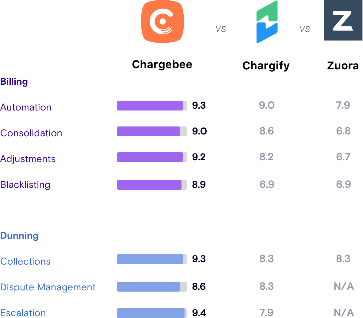 To give you a sense of the broad capabilities of subscription billing software, here's a comparison of Chargebee, Chargify, and Zuora Billing as seen in G2Crowd.